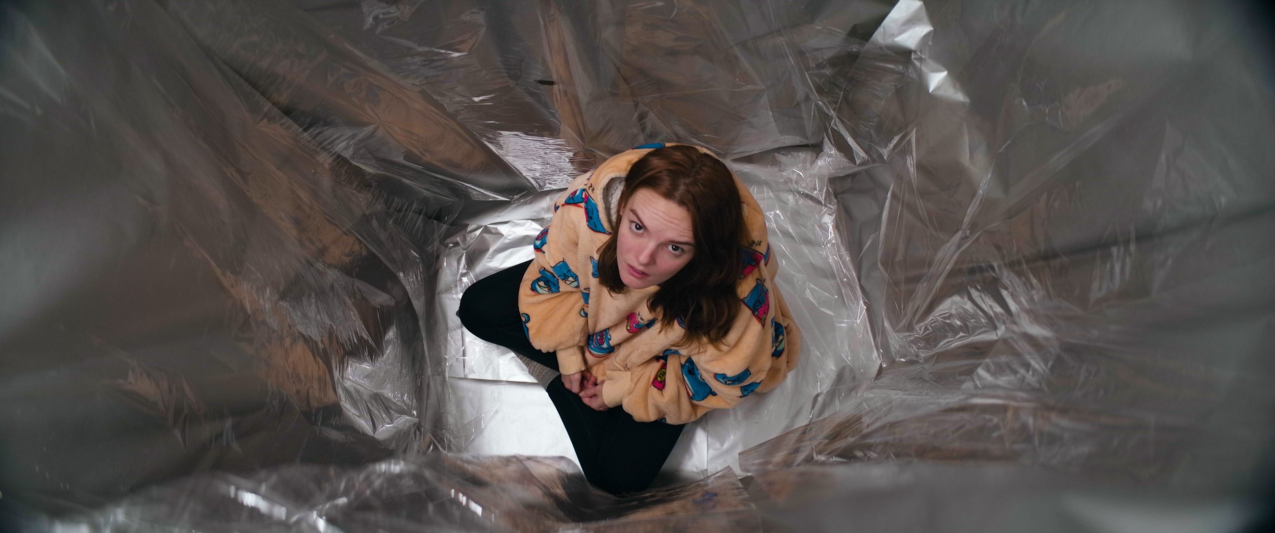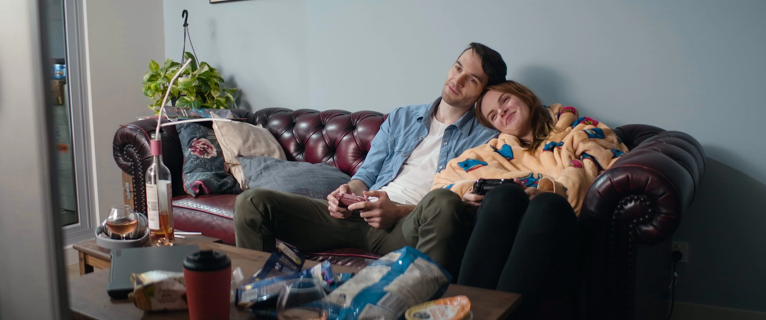A young woman seeks refuge in the comfort of a chip packet when her partner